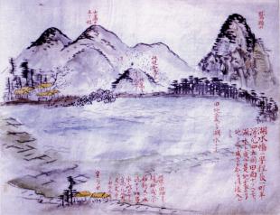 沼津藩士の祐筆であった山崎継述が描いた、地震で陥没した小林村と、下香貫塩満辺りの田地が湖水となった絵図が物語る安政東海地震